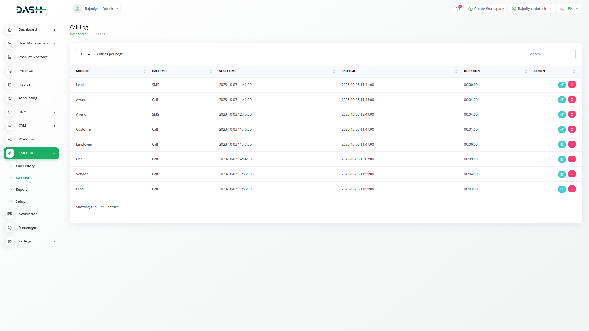 With Call Hub module, a business can see who has answered each call, how long it takes them to answer the call and how long they spend on the particular call or sms.