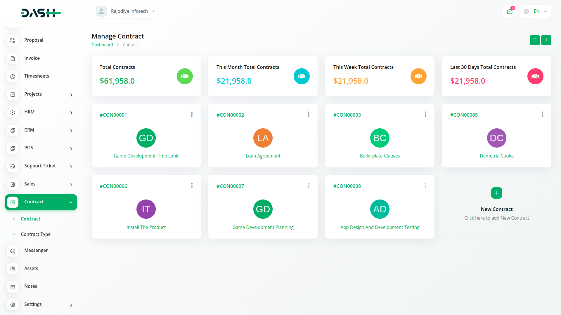 Contract Module is very helpful for proper documentation of the contracts done with clients showing the type of contract, the value, and time duration. The predefined settings can be done/ updated through Setup.