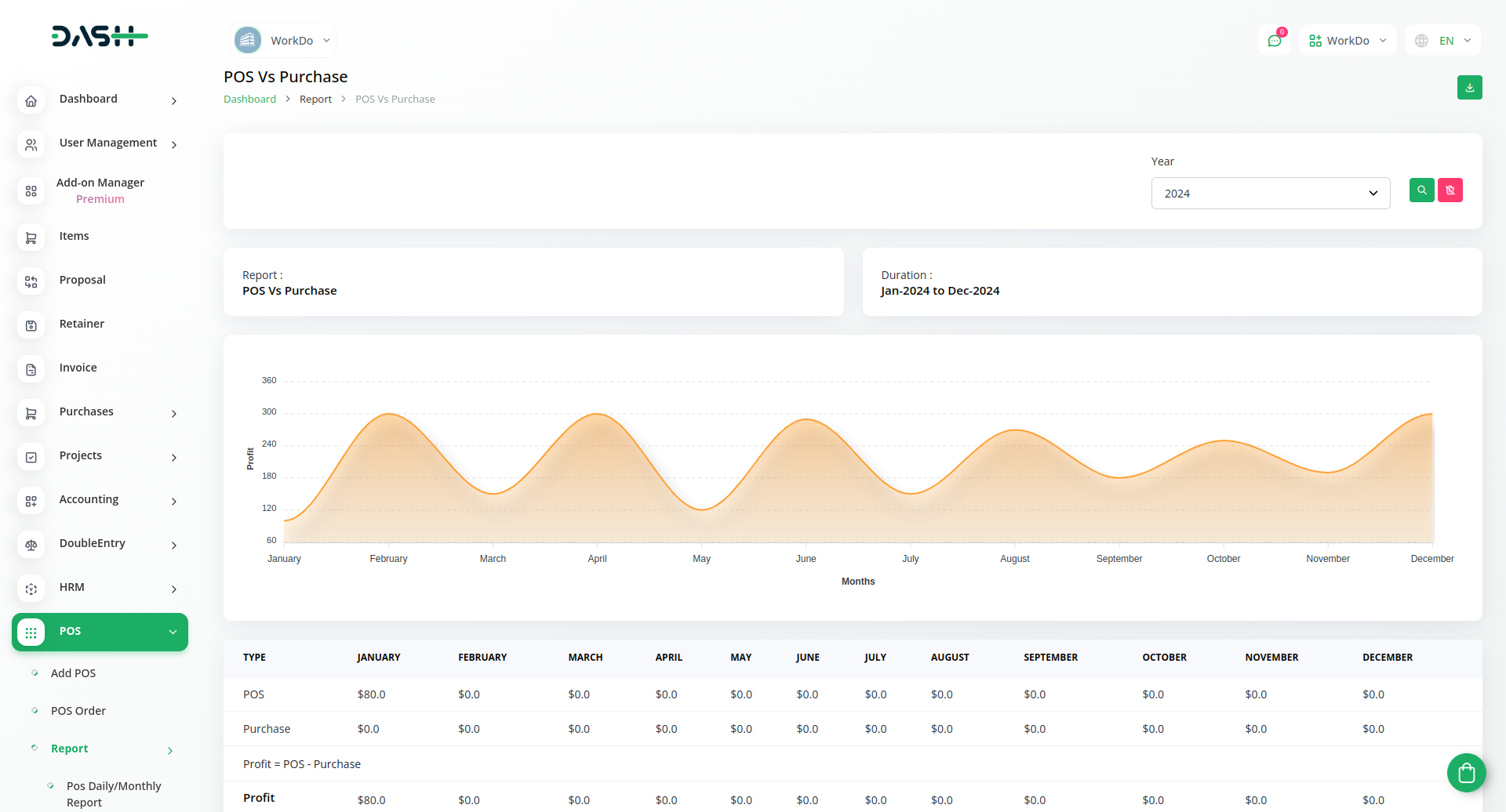 POS allows you to keep a tab on the total as well as the monthly amounts of sales and purchases. The interactive purchase sales report graph allows you to make informed decisions. You would receive notifications on the dashboard if products reach the minimum quantity.