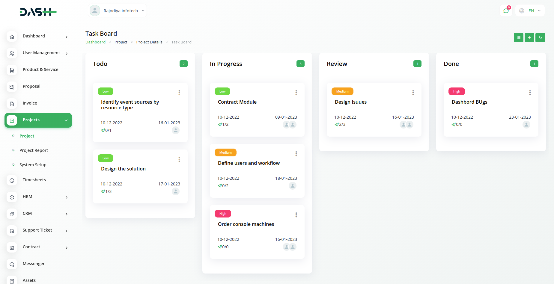 Get an overview of the total number of projects, tasks, bugs, and members. A visual representation of the task overview and project status can help you estimate the progress on each task. Lastly, you can check the top due task.