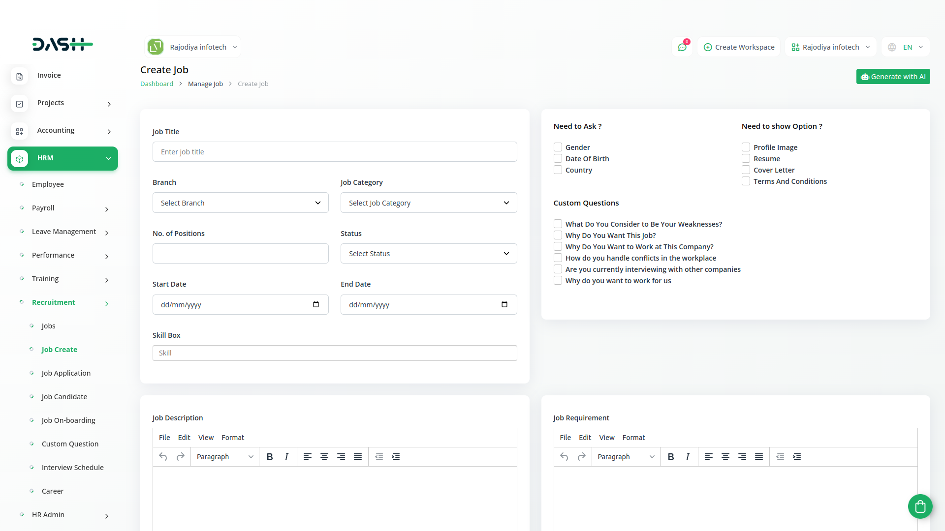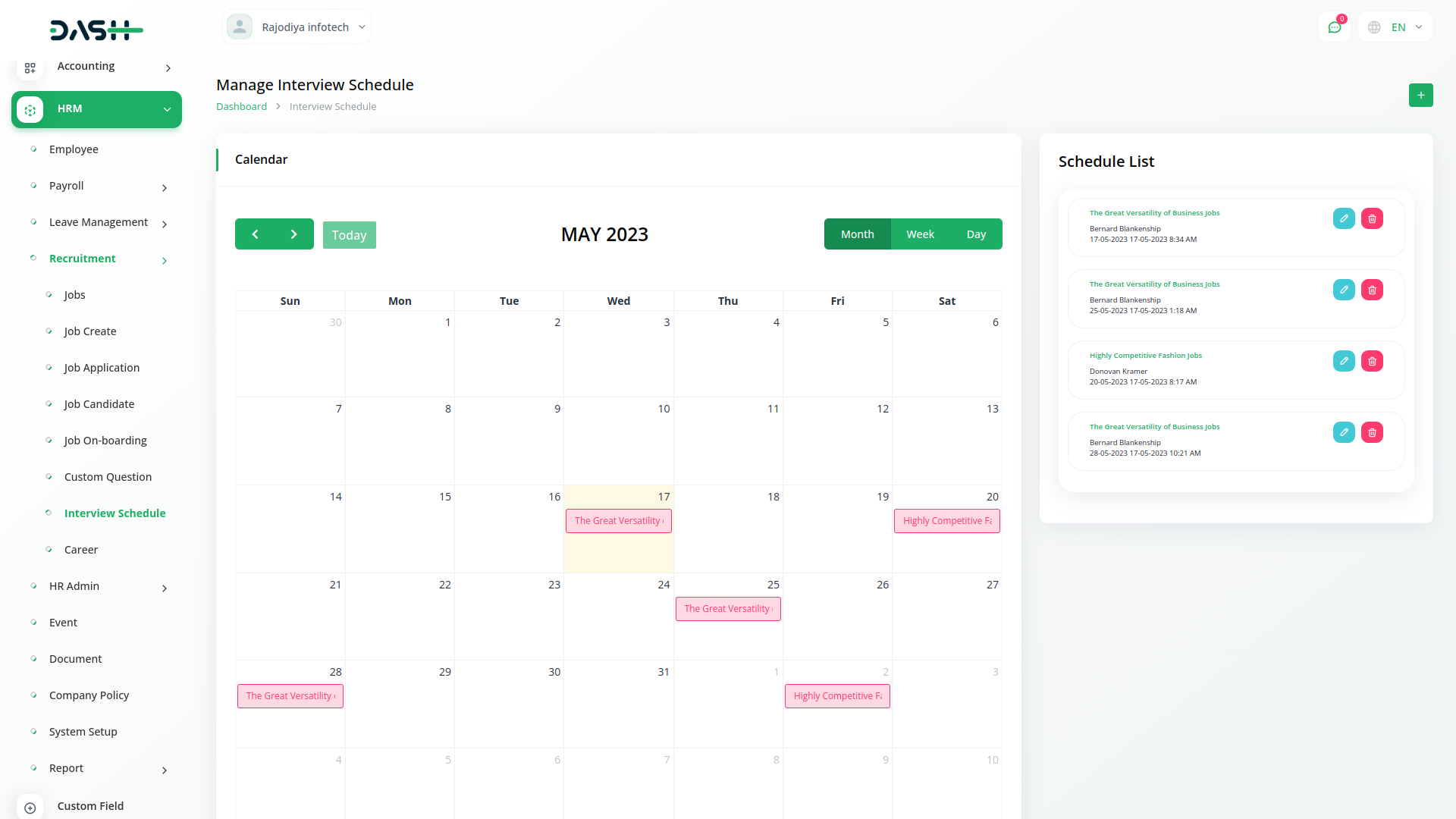 Job Post, Job application, Interview Scheduling, Custom Interview Questions, Job Onboarding, Unique link for applying for a job
